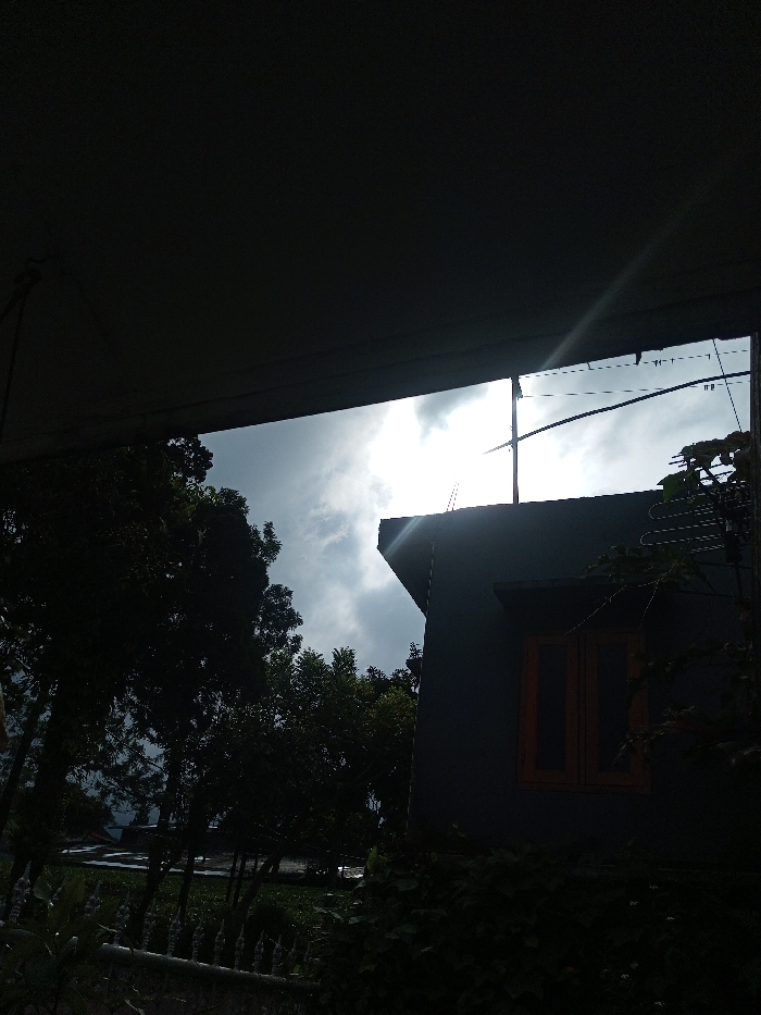 An outdoor scene in Bhendala, India, is captured from beneath a dark, overhanging structure that partially frames the top of the image. The sky, visible through the opening, is brightly lit by the sun behind heavy clouds, creating a strong backlight effect and a distinct diagonal light ray extending into the upper right shadowed area. On the right, a dark grey building with a prominent orange-brown framed rectangular window is silhouetted against the bright sky. An antenna, consisting of a central pole and horizontal elements, is mounted on the building's roof. Dense, dark green trees and foliage are silhouetted on the left and in the mid-ground. The lower foreground is heavily shadowed, revealing dark green vegetation and a low fence structure. Overhead wires are visible extending across the bright sky. No individuals or specific actions are present.