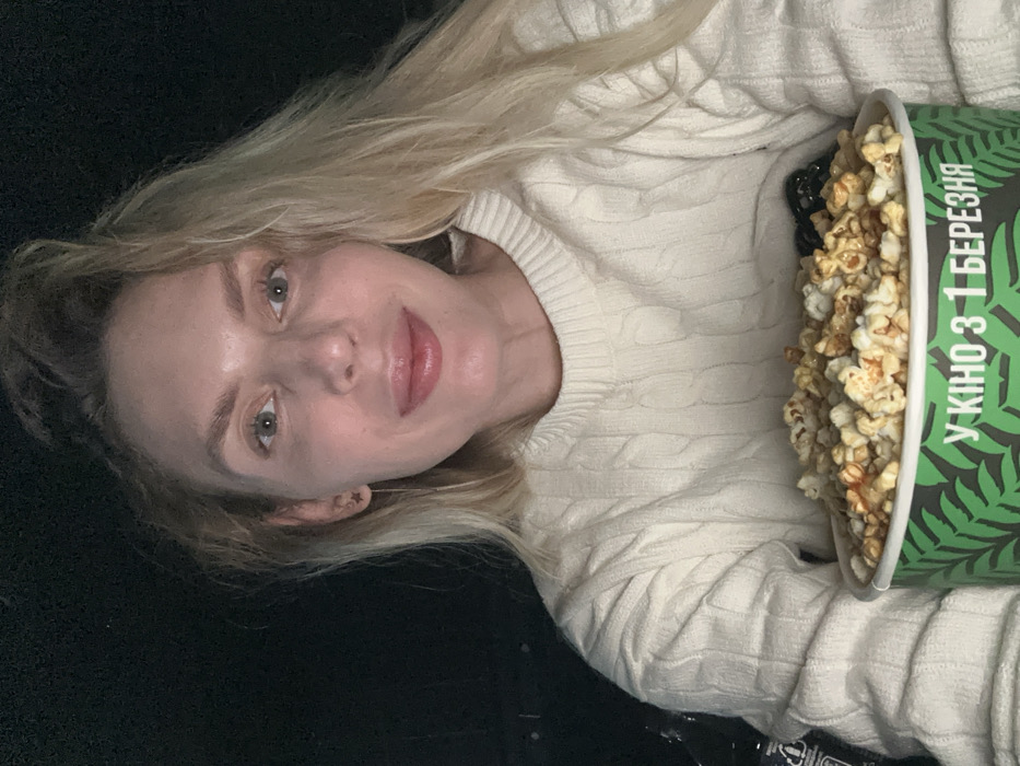 A young adult female is depicted in a close-up, front-facing shot within a dimly lit indoor environment, consistent with a cinema in Slobozhanske, Ukraine