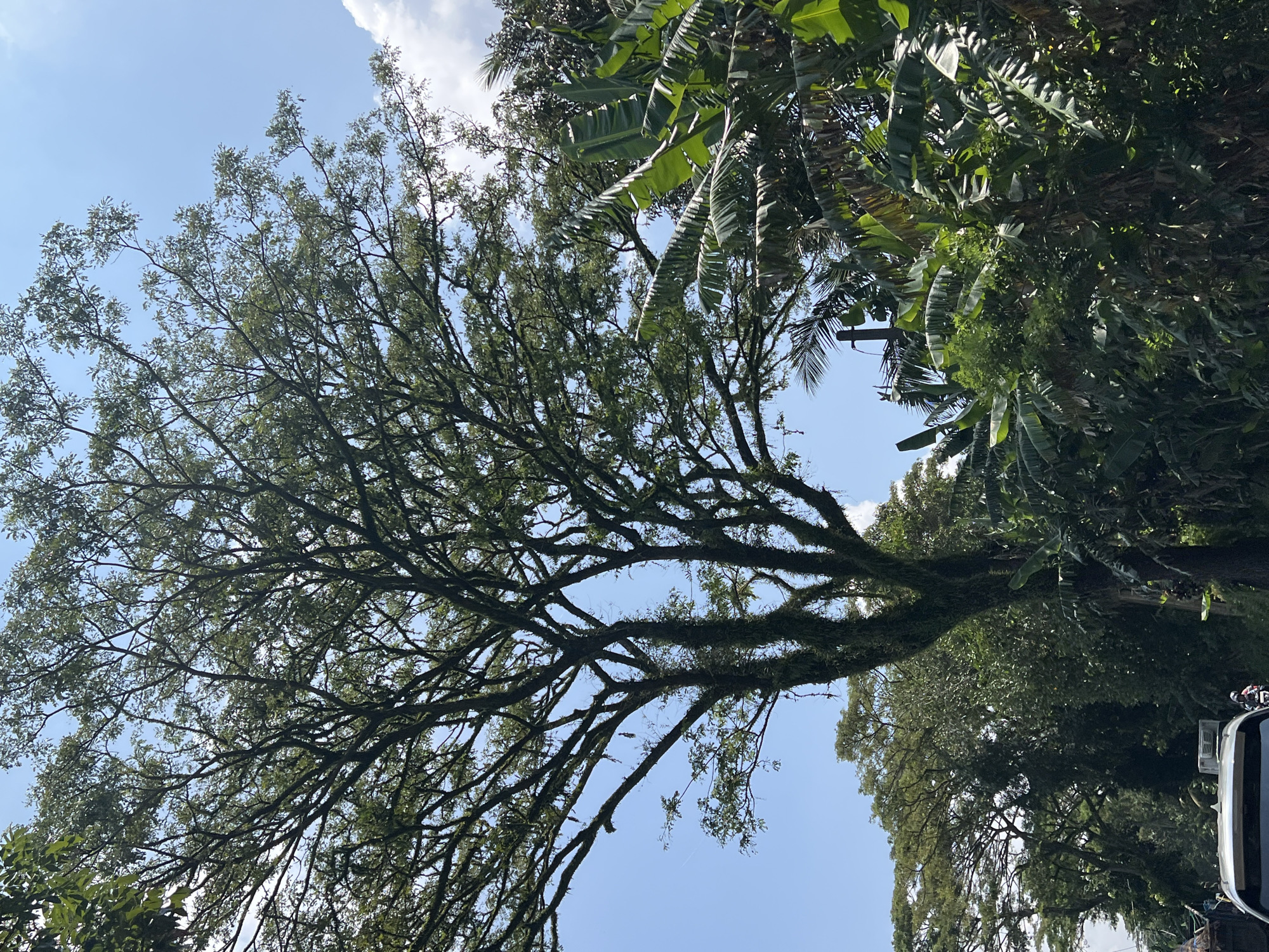 The scene depicts a daylight view in Mekarsari, Indonesia, dominated by dense tropical vegetation under a clear blue sky with scattered white cumulus clouds. A large, heavily branched tree, featuring extensive moss and epiphytic growth on its trunk and branches, occupies the left and central upper portions of the frame. Its canopy is densely foliated with small green leaves. The right side is filled with a variety of tropical plants, including prominent large green banana leaves and palm foliage, partially obscuring a dark utility pole. In the lower left quadrant, the white roof and rear window of a vehicle are visible. Behind this vehicle, a motorcyclist wearing a helmet is observed in transit, positioned near the front section of a dark-colored truck. No other human figures or overt interactions are discernible.