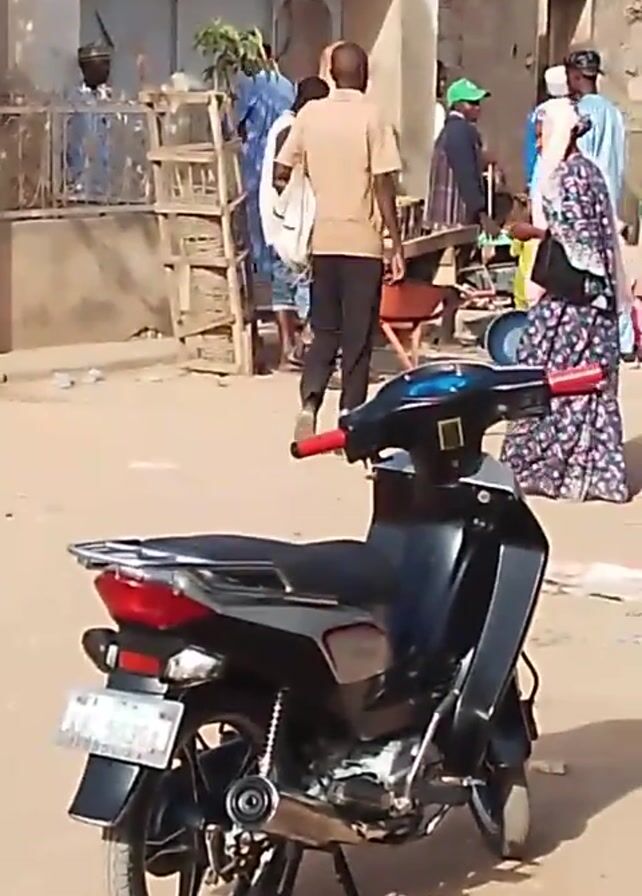A small black moped is parked on a sandy dirt road in a populated area. Behind it, a group of people dressed in various traditional clothing are gathered, some standing and others walking. There is a man in white traditional clothing and a red hat approaching the moped from the right. A cart filled with small items is visible in the background. The setting appears to be a market or a community gathering in an arid or semi-arid region. The day is bright and sunny.