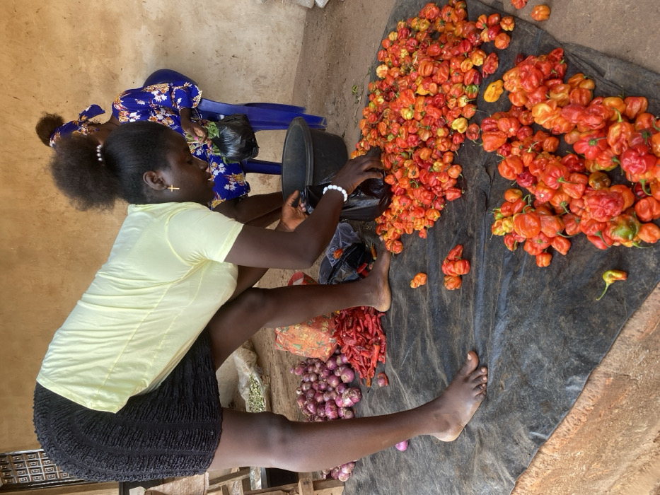 A woman with a ponytail, wearing a light yellow top and black skirt, sits barefoot on the ground sorting orange peppers into a black bucket. A woman in a blue patterned dress sits on a blue chair in the background, near other market goods. The peppers are piled on a dark cloth spread on the ground, alongside other produce including red peppers, onions and herbs. The scene appears to be a market or outdoor trading area.