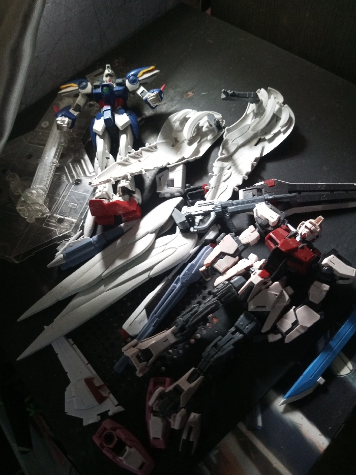- "The scene depicts a collection of plastic model kits, specifically mecha figures, arranged on a dark, flat surface within an indoor environment" by FM-ltSLb2, licensed under CC BY 4.0