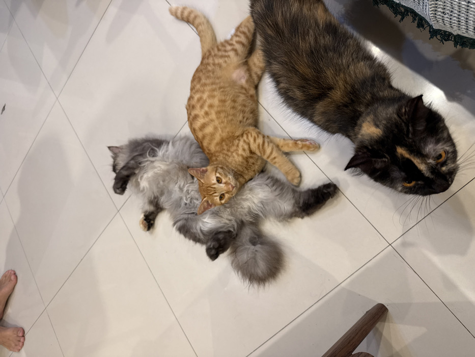 The image captures an indoor scene on a white tiled floor in Denpasar, Indonesia. Three felines are present: a long-haired grey cat lies supine, its paws slightly curled, with its head oriented towards the upper right. An orange tabby cat rests on its left side, positioned atop the grey cat's abdomen and left hind leg, with its head facing the camera. Partially visible in the lower right foreground is a dark tortoiseshell cat, presenting its head and upper back, with its gaze directed towards the center. In the upper left corner, a pair of bare human feet stands on the tiled surface. A segment of a dark wooden furniture leg is visible on the far left, and a portion of a light-colored woven fabric with dark fringe is on the far right.