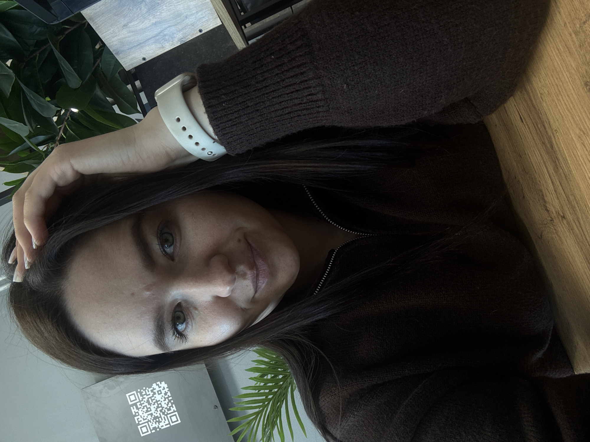 A medium close-up photograph depicts a female individual seated indoors at a light-colored wooden table, within what appears to be a cafe or similar establishment in the city of Chaikovsky, Russia. The subject, possessing dark brown hair parted slightly to her left and light-colored eyes, faces the camera with a subtle smile. She is wearing a dark brown, possibly knitted, zippered top. Her left hand is raised, with manicured fingers touching her hair near her left temple. A light-colored smartwatch with a perforated strap is visible on her left wrist. The background features a light grey wall on the left, displaying a white QR code on a dark square panel. Green foliage from two distinct plants, one with broad leaves and another with slender fronds, is visible behind the subject. Additional elements in the background include a light wooden panel and dark structural components on the right.