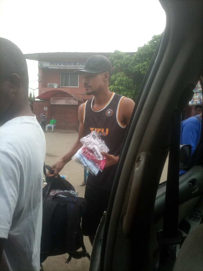 A man in a black tank top and cap stands outside a car, holding a stack of clothes. He also has a backpack. Buildings are visible in the background, including one with "Riverside" on it. Another man is visible to the left, wearing a white shirt, and another man in blue is on the right. The image is taken from inside a car.