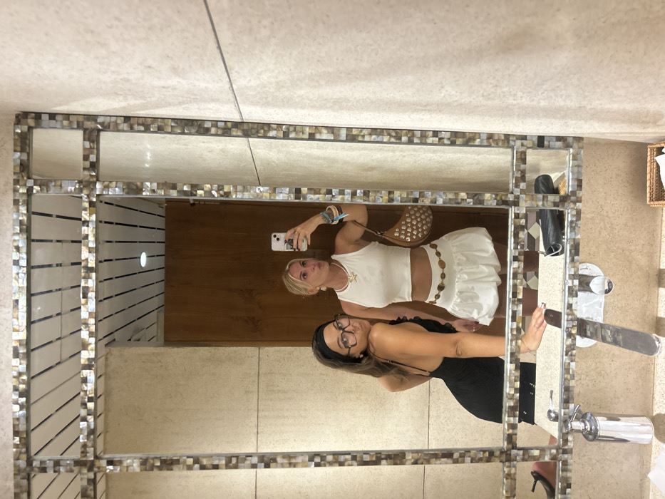 Two adult females are visible in a mirror selfie taken within an interior space, identified as being in Pecatu, Indonesia. The setting appears to be a bathroom or changing room. The mirror, which occupies the majority of the frame, features a decorative border composed of small, rectangular, iridescent tiles, possibly mother-of-pearl. Reflected in the mirror are two women, a light-beige tiled wall, a plain wooden door, and a ceiling with linear paneling and a single recessed light fixture. Below the mirror, a light-colored speckled countertop is visible, equipped with a chrome-colored faucet and a matching pump soap dispenser. A small woven basket is partially visible on the floor to the lower right. The woman on the left has dark hair, styled with a black headband, and wears dark-rimmed eyeglasses. She is dressed in a black spaghetti strap dress and is posed with her head tilted, lips slightly pursed, and her right hand resting on the countertop. The woman on the right, who is holding a white smartphone (likely an iPhone) in her right hand to capture the mirror selfie, has blonde hair pulled back. She is attired in a white sleeveless crop top, a white high-waisted bubble skirt, and a gold-colored coin chain belt. She wears a necklace with a gold-colored pendant and multiple bracelets on her left wrist. A brown, studded crescent-shaped shoulder bag is slung over her left shoulder. She is also posing with her lips slightly pursed while looking towards the phone's camera.