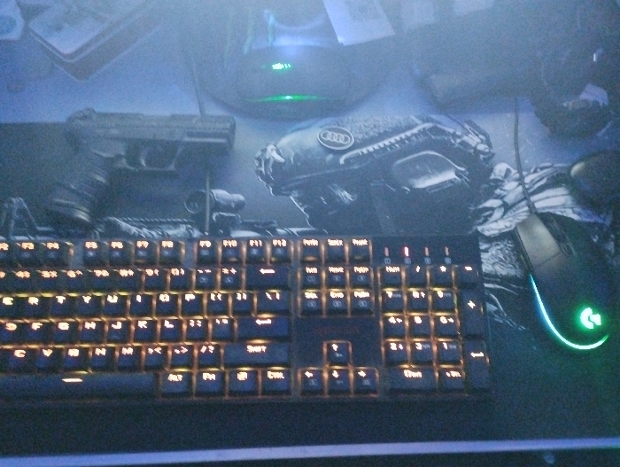 The scene depicts an indoor desk setup, likely a personal computer workstation or gaming station. The precise city and specific location within that city are unknown. In the foreground, a black mechanical keyboard with amber-orange backlighting illuminating the keycaps is positioned centrally. Behind the keyboard, a large, dark-colored mousepad displays a graphic design featuring military-style equipment, including a helmet with "AUDI" branding visible on its side, and other tactical gear. To the left on the mousepad, a black handgun-shaped object, resembling a semi-automatic pistol, rests horizontally. To the right of the keyboard, also on the mousepad, is a black gaming mouse with a green illuminated "G" logo, consistent with a Logitech G-series peripheral. A black cable extends from the mouse upwards. In the upper background, partially visible items include a dark object with a green LED light, possibly a headphone stand or another electronic device, and a corner of a white book or notepad. Another dark object, possibly a headset, is partially visible in the upper right quadrant. No individuals are present in the frame. The overall lighting is dim, with localized illumination from the keyboard's backlighting and the mouse's LED.