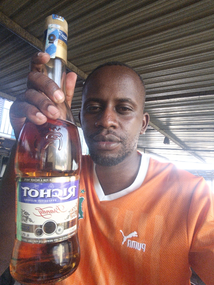 A close-up, selfie-style photograph depicts a single adult male, appearing to be of African descent, with short dark hair and a short beard, looking directly into the camera. He is wearing an orange short-sleeved sports jersey with a white V-neck collar; a white "Puma" logo is visible on the right chest (reversed), and an emblem resembling a national flag (possibly Ivory Coast) is on the left. His left hand is raised, holding a clear glass bottle containing an amber liquid. The bottle's label, appearing reversed, identifies the product as "RICHOT PERFECTLY BLENDED Brandy" and shows additional text including "UDA KEMAY." The bottle is sealed with a gold-colored cap featuring blue and white elements. The background consists primarily of a corrugated metallic roof structure, indicating a sheltered outdoor or semi-outdoor setting. The lighting suggests daytime conditions. The scene is situated in Athi River ward, Kenya.