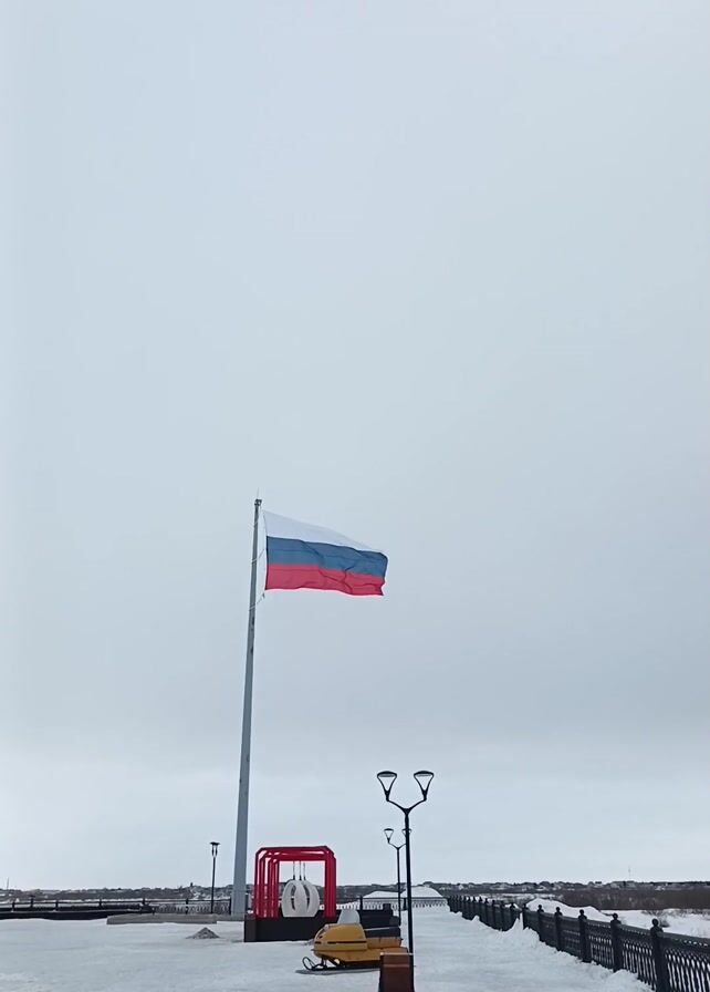 The scene is a bleak, overcast winter day. A Russian flag, a tricolor of white, blue, and red, flaps prominently on a tall pole. The ground is covered in snow, and the foreground features a bench, a red metal structure, and several streetlights lining a walkway with an ornate black metal railing along the edge. A horizon line suggests a distant landmass. A strong wind is evidently blowing as the flag flutters vigorously.
