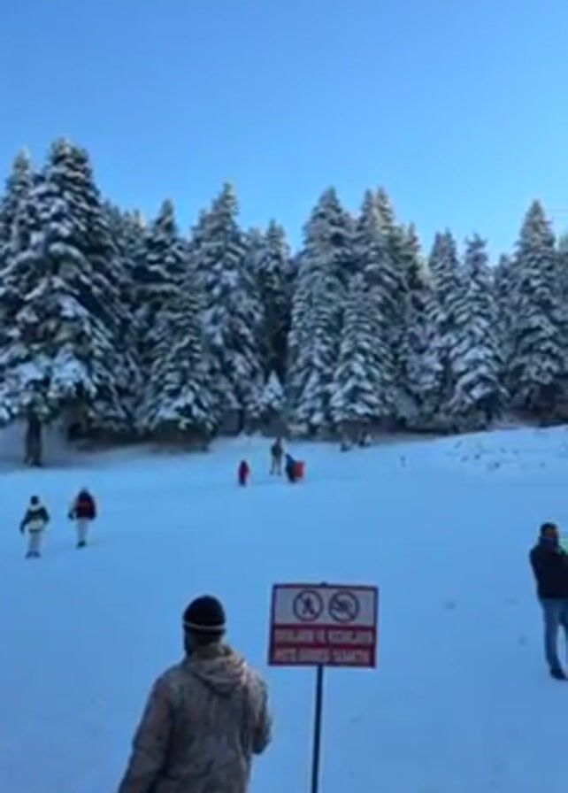 The video depicts a snowy scene with several people enjoying a winter day. In the foreground, a person wearing a camouflage jacket and a black headband is walking on the snow. A sign is visible with a red border and white text, indicating a prohibition against walking or sledding in a specific area. Further in the background, several individuals are scattered across the snow-covered field, some walking and others appearing to be engaged in activities like sledding. The backdrop consists of dense evergreen trees heavily laden with snow. The sky is a clear, bright blue, contributing to the overall sunny and crisp winter ambiance.
