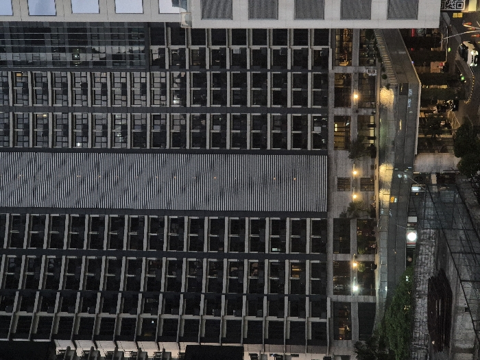 The image depicts a high-rise urban environment at dusk or night, featuring a dominant dark-facade skyscraper identified as the Shangri-La at the Fort, located in Makati, Philippines. The central subject is a multi-story building with a dark gray facade. Its upper sections display numerous balconies with light-colored railings arranged in a grid pattern. A prominent, light gray vertical strip with horizontal louvered panels runs centrally up the building's height. Scattered interior lights are active in various windows, indicating occupancy. The lower levels of this building feature larger windows, brightly illuminated, suggesting lobby, retail, or amenity spaces. Above a ground-level vehicle entrance, a reflective surface, possibly a swimming pool or water feature, is visible. To the immediate right, a portion of an adjacent, lighter-colored building is visible, characterized by a uniform grid of dark, square windows. At the base of the main building, a covered driveway or drop-off point is illuminated. A white SUV is observed exiting or entering on the right side of this driveway, while another dark vehicle is partially visible further under the overhang. Streetlights and building lights cast reflections on the wet-appearing ground surface. In the lower left foreground, a concrete rooftop or elevated platform is visible, supporting stacks of dark, rectangular materials, possibly construction rebar or metal grids. Dense green foliage partially obscures the left side of the main building's lower structure. The overall lighting suggests an evening setting, with artificial light sources providing the primary illumination.