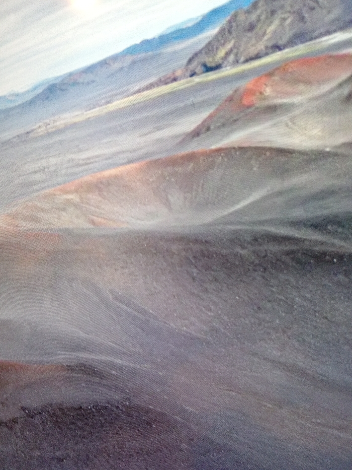 Undulating gray and brown terrain stretches across the frame, punctuated by hints of red and orange hues