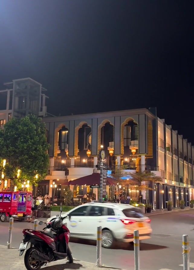 street scene at night in what appears to be a tourist area. The main focus is a building that looks like a restaurant or hotel, decorated with arched windows and lit with warm lights. A red scooter is parked on the sidewalk in the foreground. Cars, including a white sedan, and a red and pink vehicle that appear to be motorized tuk-tuks, pass by on the street. Several pedestrians are seen walking on the sidewalk and crossing the street. A large tree with decorative lights is visible to the left of the building. The overall atmosphere is lively and inviting.