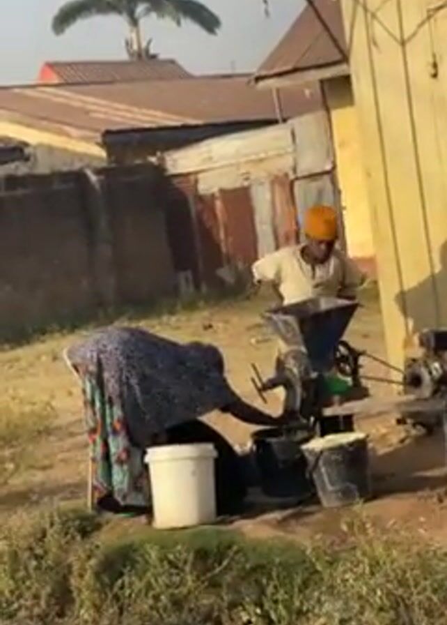 Two people are operating a grinding machine outdoors on a sunny day. The machine is old and possibly powered by a gas engine. One person, wearing a head covering, is bent over, handling white buckets that appear to be catching the ground product. The other person, wearing a light-colored outfit and a yellow headwrap, is feeding the machine. They are in a grassy area next to some buildings, including one made of corrugated metal and another painted in light yellow. A palm tree is visible in the background.
