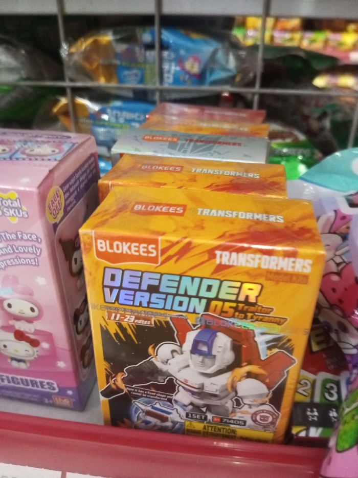 On a store shelf, a "Blokees Transformers Defender Version 05" toy is featured prominently. The box is yellow and displays a robot image with "Traitor to Tyranny" written. Next to it is a pink box with images of Hello Kitty and friends with “The Face, And Lovely Expressions!” printed on it. Behind, a row of the Blokees boxes can be seen. Above, a wire shelf holds various packaged items. Other colorful toy packaging is partially visible.