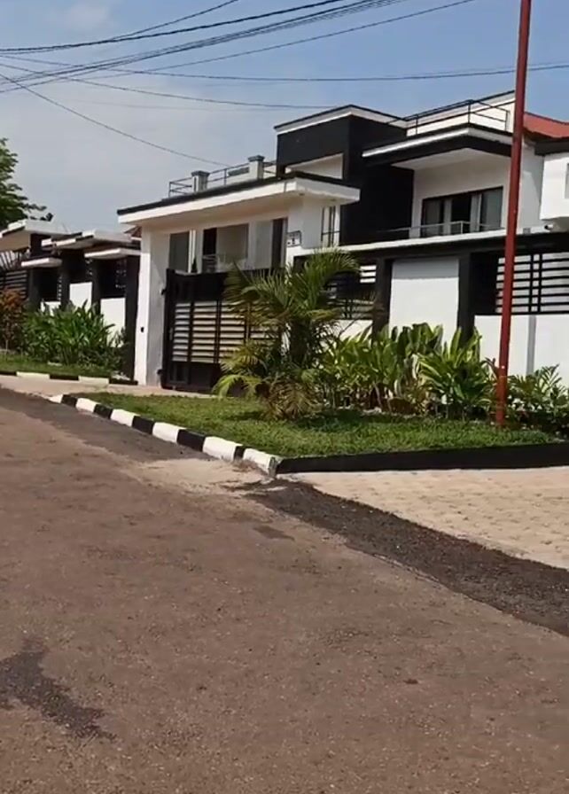 street lined with modern houses. The houses are predominantly white with black accents and feature well-maintained lawns and landscaping. The street is paved and has a black and white curb. There are utility poles and power lines visible overhead. The weather appears sunny with a clear blue sky. The camera moves slowly along the street, providing a view of the houses from the road. The gate in front of one of the houses has a decorative design. A house number, "6C" is visible on the facade of one of the houses.