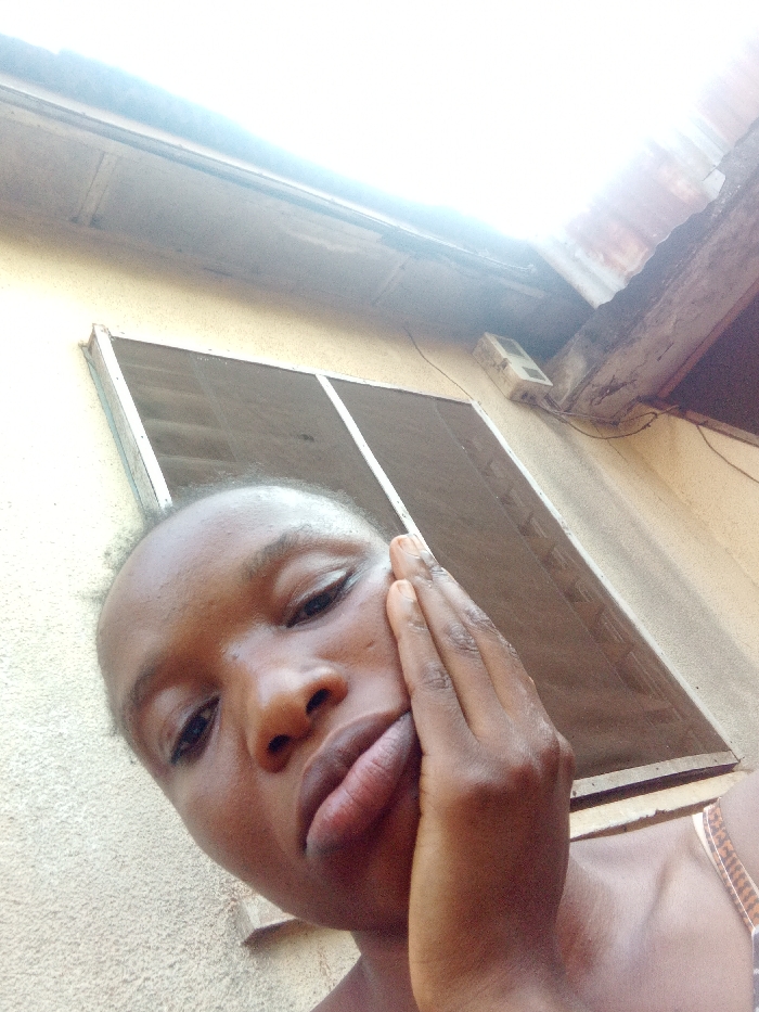 A close-up, low-angle selfie depicts a young Black female positioned in the foreground, filling the lower-left portion of the frame. Her head is tilted slightly to the right, and her eyes are directed towards the camera. Her right hand is pressed against the right side of her face, with fingers slightly spread. She has short, dark hair and full lips, and appears to be wearing a light-colored, possibly patterned, strap on her right shoulder. The background consists of an exterior building wall, painted a textured light beige or yellow. A rectangular window with a light frame and dark mesh screen is visible behind her, partially obscured by her head. Above and to the right of the window, a white electrical box or fixture is mounted on the wall, with dark wires extending from it. Above the wall, a section of an old, weathered corrugated metal roof and wooden eaves are discernible. The scene is illuminated by bright, natural daylight, with evidence of overexposure in the upper-right corner. The location is an unspecified outdoor area within the city of Unknown, Unknown.
