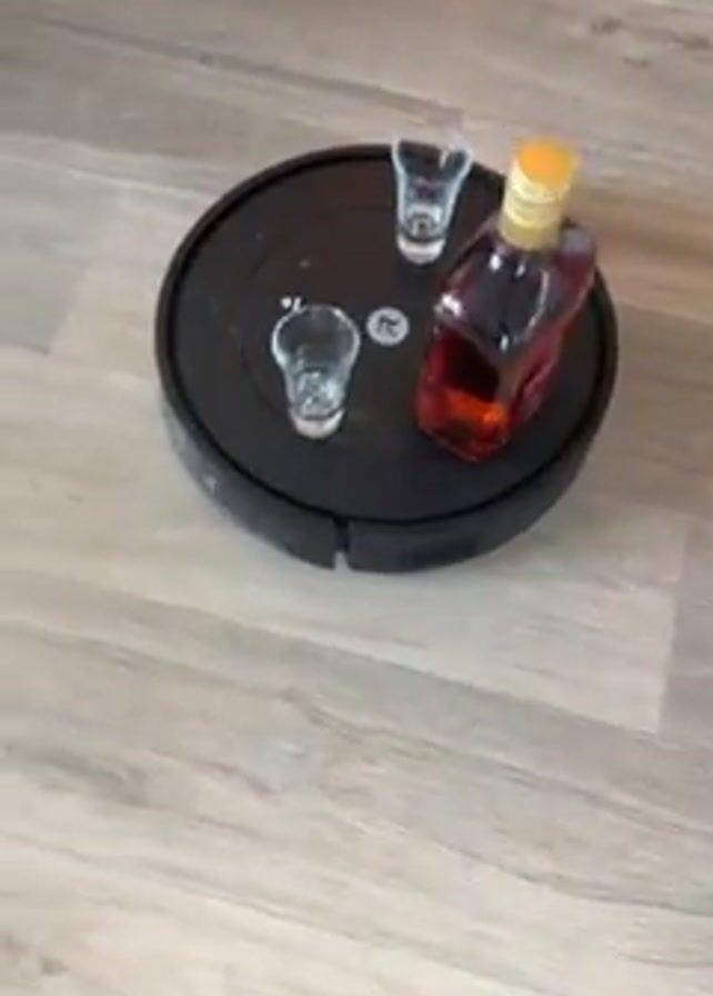black, circular iRobot Roomba moving across a light brown, wood-patterned floor. On top of the Roomba sits a square bottle of brown liquid, presumably alcohol, sealed with a gold-colored cap. Two small, clear shot glasses are also placed on the Roomba's surface, one on either side of the bottle. The Roomba is moving slowly across the floor. A wooden chair leg is partially visible in the background.
