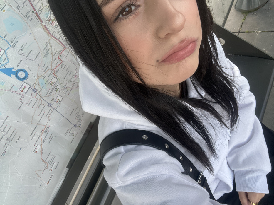 A young woman is captured in a close-up, selfie-style image, seated outdoors in Strasbourg, France