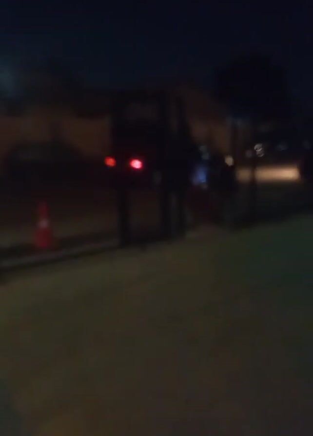 dimly lit outdoor scene at night. There is a man wearing a dark suit and red tie standing near what appears to be a gate or fence. Behind the gate are several parked cars with their lights visible. There is also an orange traffic cone next to the gate. The video is somewhat blurry, and the exact details are difficult to discern due to the low light conditions.