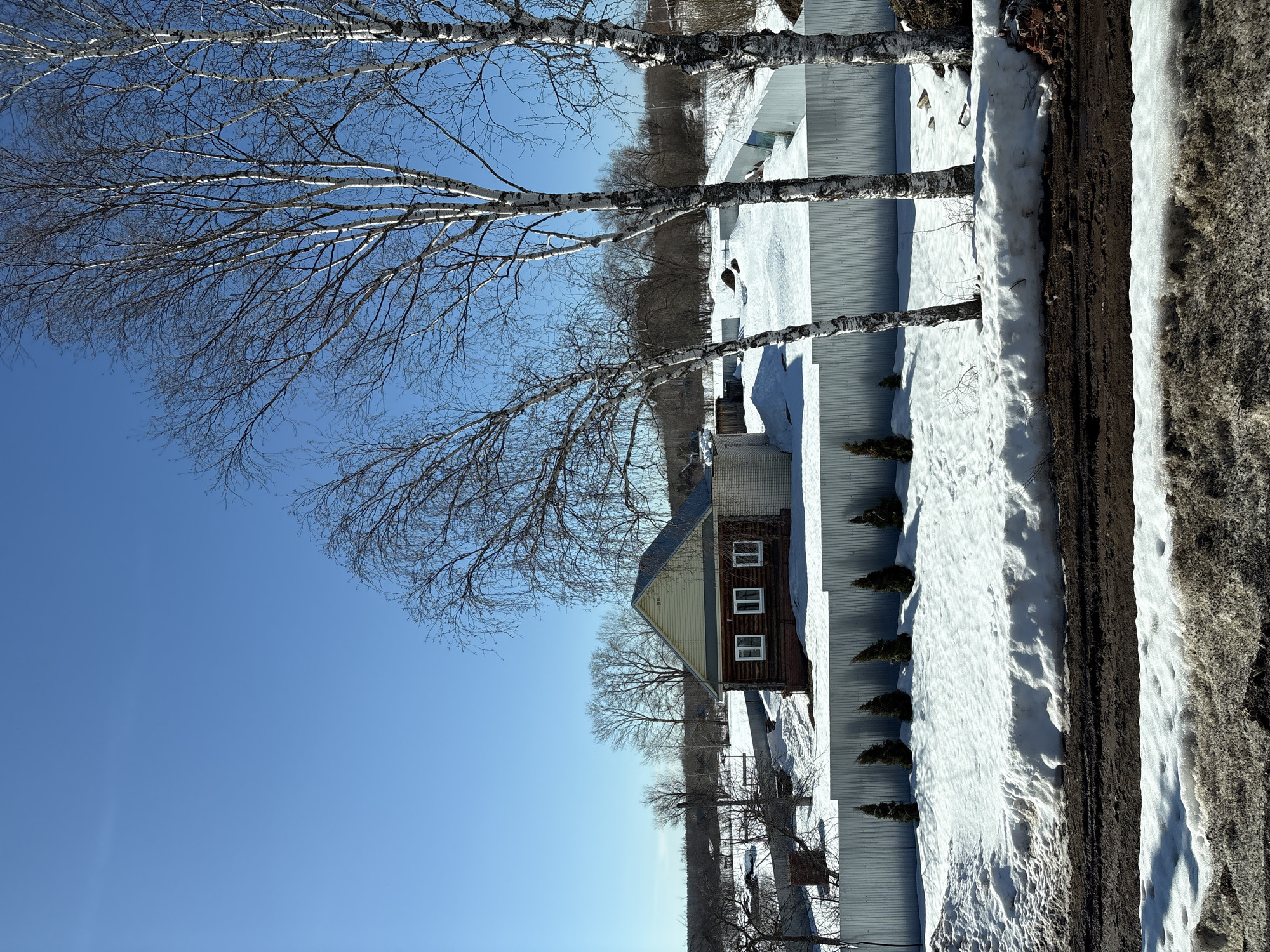 The image depicts an outdoor residential scene in the city of Кварса, Russia, under a clear, bright blue sky. In the immediate foreground, a dark, muddy dirt road runs horizontally, bordered by patches of melting snow. Immediately beyond this, a row of approximately six small, dark green coniferous shrubs is planted along a light grey corrugated metal fence that extends across the midground. Behind the fence, several tall, bare-branched birch trees with white and dark bark are prominent, their branches reaching towards the upper frame. Centered in the midground, a two-story residential house is visible, constructed with a lower section of horizontal logs and an upper gable section featuring light-colored horizontal siding and three equally spaced rectangular windows. A partial brick structure or section is visible on the right side of the house. The ground behind the fence and house is covered in snow, sloping downwards. The background reveals a landscape of numerous bare deciduous trees and brush under the expansive clear sky, characteristic of late winter or early spring conditions. No individuals or active interactions are present in the scene.
