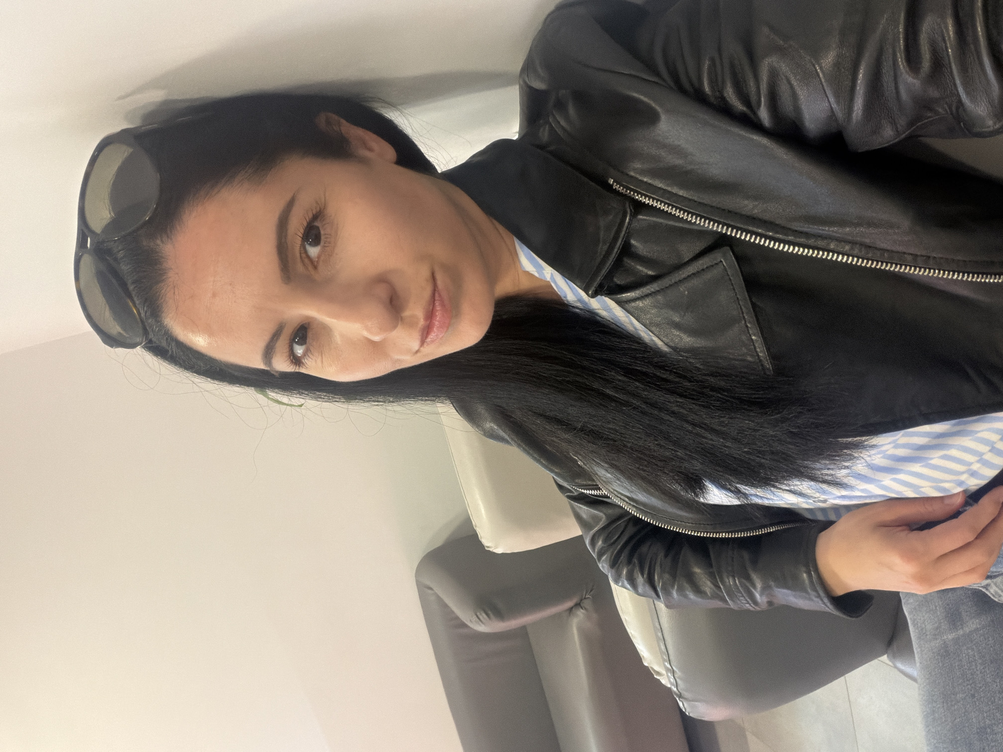 A woman with long, dark hair and sunglasses perched on her head is seated indoors, wearing a black leather jacket over a blue and white striped shirt