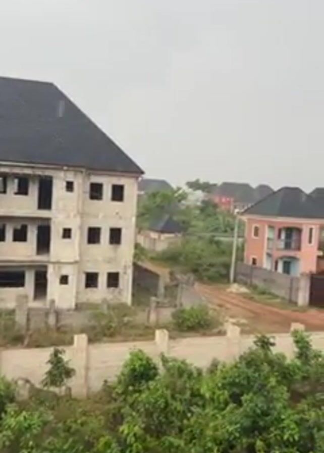 The view from a high vantage point reveals a scene in what appears to be a residential area. In the foreground, lush green vegetation partially obscures a perimeter wall. To the left, a three-story building stands unfinished, its concrete structure exposed with empty window openings. To the right, a completed two-story house painted in a muted pink hue with a dark roof is visible. An unpaved road or path meanders through the vegetation between the buildings. The sky is overcast, suggesting a cloudy day, and faint rain can be seen. The overall atmosphere is subdued, with a sense of quietude in the neighborhood.