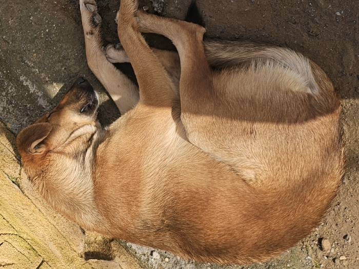 - "A light brown, medium-sized dog is observed lying curled on its right side, sleeping, on a mixed surface of concrete and dirt in Salé, Morocco" by FM-HWmcZ2, licensed under CC BY 4.0