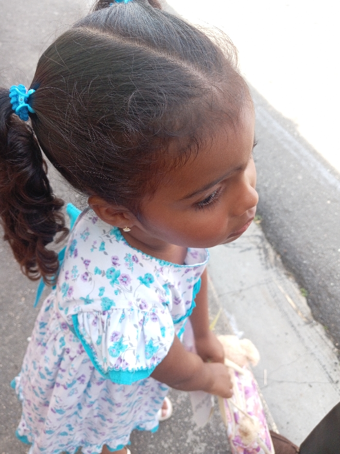 A young girl with dark hair styled in two pigtails secured with blue scrunchies looks away from the camera. She wears a light-colored dress with a floral pattern and blue trim, her skin tone is brown. An earring is visible on her left ear. The background includes a sidewalk and what appears to be a doll in her hands.
