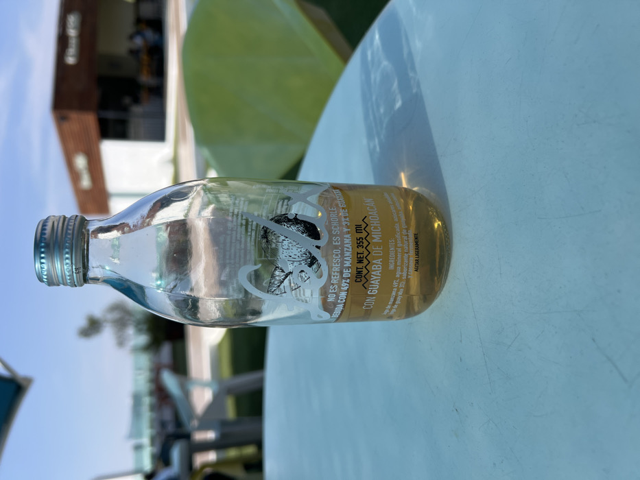 A clear glass bottle rests horizontally on a light-colored, possibly white or pale blue, surface. The bottle label reads "NO ES REFRESCO, ES SCHORLE NEBIDA CON 49% DE MANZANA Y 3% DE GUAYABA", and "CON GUAYABA DE MICHOACAN". A tree leaf can be seen behind the bottle. The bottle appears to contain a yellow or light brown beverage. The background shows a blurred outdoor scene with buildings and trees. The bottle has a silver cap.