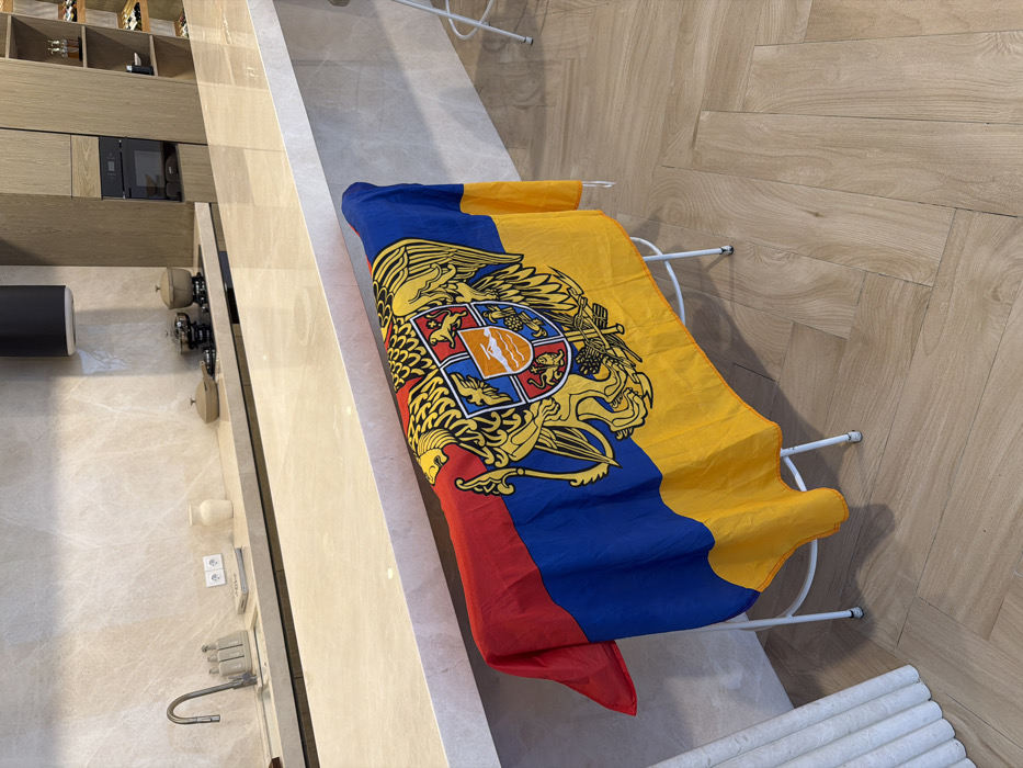 The image displays a modern, clean kitchen interior. In the foreground, an Armenian flag, identifiable by its red, blue, and orange horizontal stripes and the national coat of arms (featuring an eagle and a lion supporting a shield), is draped over a white, metal-framed stool. The floor is covered in light-toned wood planks arranged in a herringbone pattern. Adjacent to the stool is a long, light-colored, reflective kitchen island, likely made of stone, behind which stands a matching countertop with a backsplash. On the countertop, a gooseneck faucet is positioned over a sink, flanked by three dispenser bottles and two electrical outlets. Further along the counter, a small white vase is present. A black range hood is suspended above a stovetop where two cooking pots are visible. Integrated into light wood cabinetry are a built-in oven and a shelving unit containing several bottles, possibly spirits or wine. A second white, metal-framed stool is partially visible on the far right. No people are present in the scene. The image provides no specific visual cues to confirm the location as Pecatu, Indonesia.