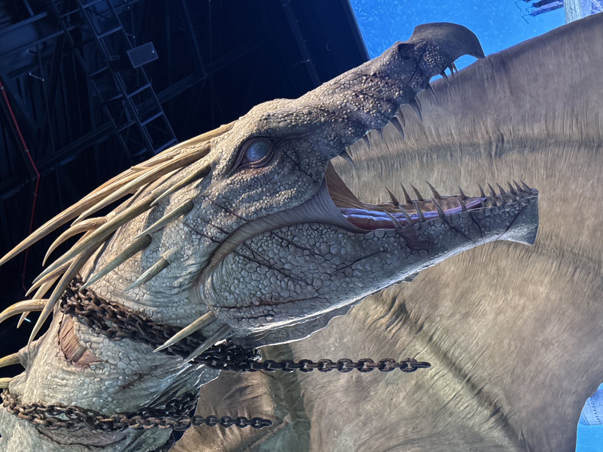 The image depicts a detailed animatronic or prop of a Ukrainian Ironbelly dragon, situated at the Warner Bros. Studio Tour London - The Making of Harry Potter in Leavesden, Watford, United Kingdom. The dragon's head and upper body are visible, angled downwards and to the right, dominating the foreground. Its skin is light grey-tan, textured with reptilian scales. Sharp, bone-colored spikes protrude from its head and dorsal ridge. A light blue eye with a dark, vertical pupil is present. The mouth is open, displaying multiple rows of pointed white teeth against a pinkish interior. Heavy, dark metal chains are wrapped around the creature's neck and upper torso, some segments hanging loosely. An area on its back exhibits reddish-brown discoloration beneath a pressed chain, suggesting wear. The background is composed of a dark blue and black ceiling structure, featuring metal trusses, support beams, and overhead speakers, with a red pipe or conduit also visible. The lower right background shifts to a bright blue, indicative of an illuminated display. The scene is uniformly illuminated by artificial light sources.