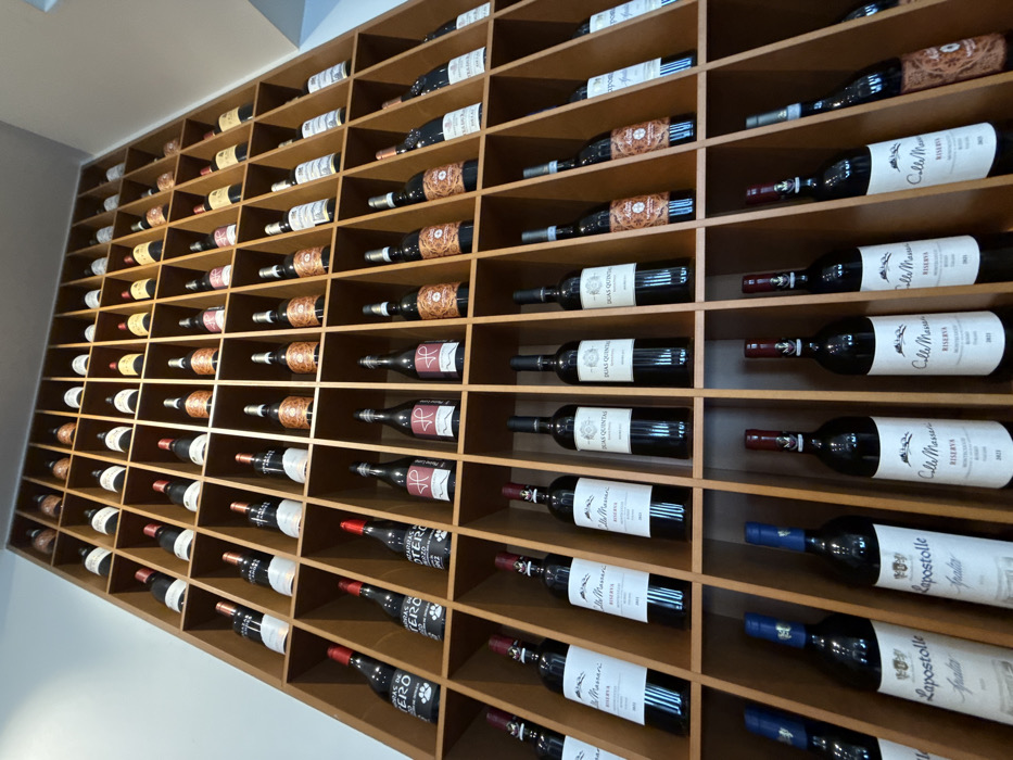 A vertical, multi-tiered wooden wine rack is depicted, installed against a plain, light-colored wall within an indoor establishment in Geneva, Switzerland