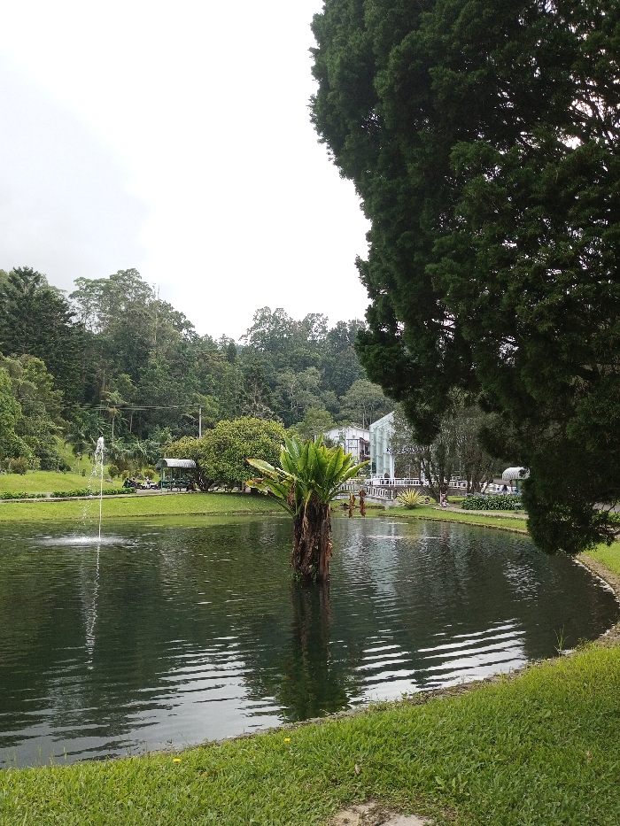The image captures a park scene in Ambositra, Madagascar, under an overcast sky. A dark-surfaced pond dominates the lower two-thirds of the frame, edged by manicured green grass. A water fountain sprays upwards from the pond's left side, producing visible ripples. Centrally, a thick-trunked plant with large, green fronds emerges from the pond. To the immediate right, a dense, dark green conifer-like tree partially frames the composition. Beyond the pond, a green lawn ascends gently towards a cluster of structures. On the left mid-ground, a white-roofed gazebo or open shelter is present on the grass, with at least two small, golf-cart-like vehicles nearby. Further right and behind the pond, a modern, multi-story white building with extensive glass paneling and a prominent white balustrade is visible. Several small, indistinct human figures are scattered on a paved path in front of this building and to its right, where a small white tent or canopy is also situated. The background consists of a dense, verdant forest covering a distant hillside, rising under a pale, uniformly grey sky.