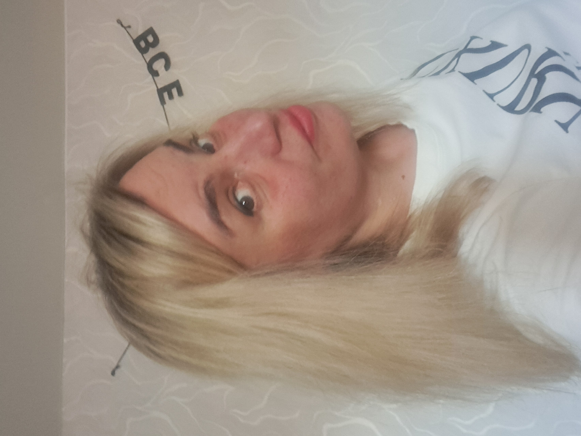 The image is a selfie of a woman with fair skin and light blonde hair, lying down. Her head is turned to the side, and she is looking towards the camera. She has visible eyebrows, a nose, and red lips. She is wearing a white top. In the background, there is a wall and bedding. The bedding has a pattern on it. The word "BCE" is visible in the upper left corner, possibly part of a larger inscription or design. No specific landmarks or features are discernible that would confirm the location as Elektrostal, Russia.