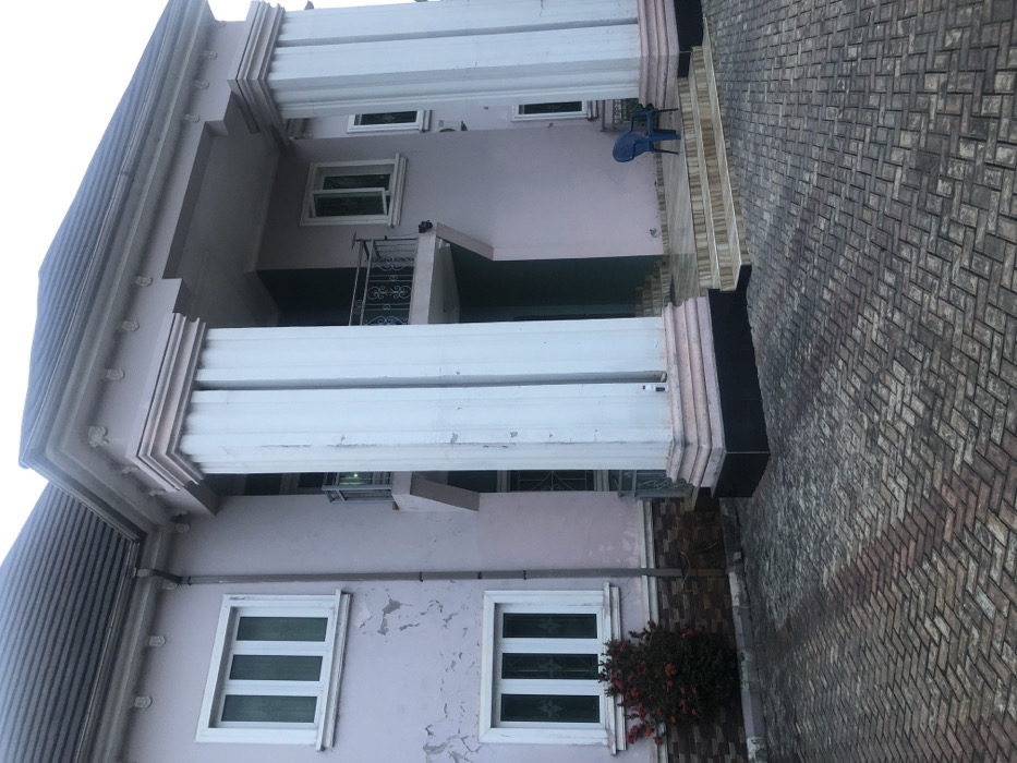 A two-story building with a pale pink exterior and white trim dominates the frame
