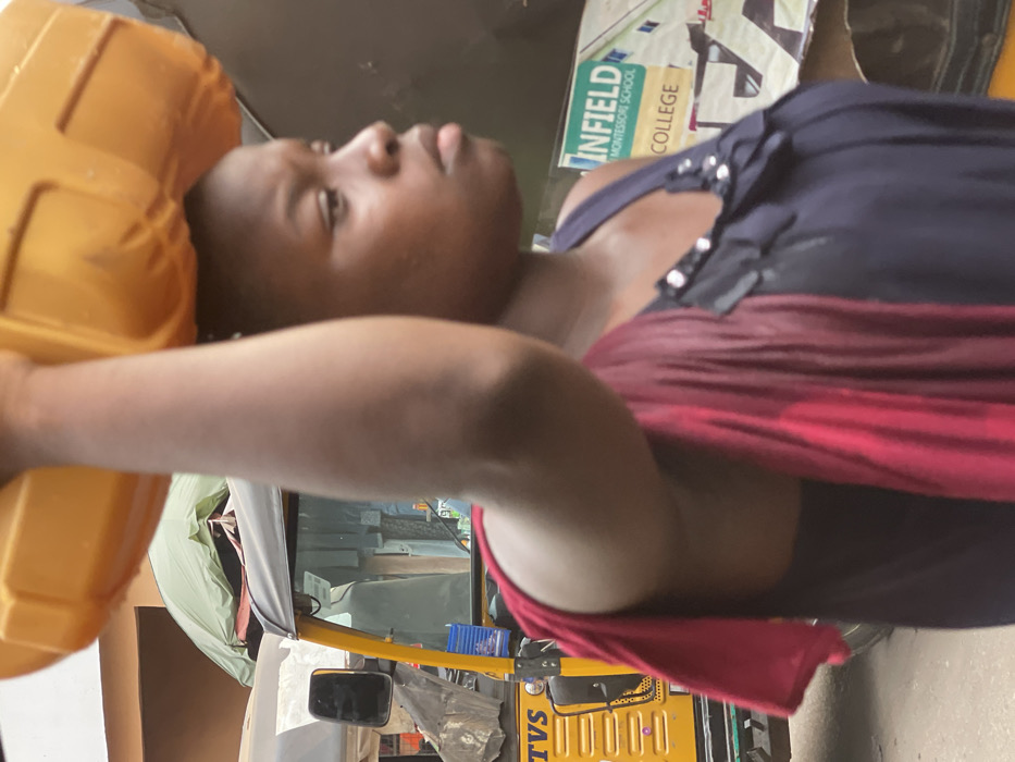 A young female, dark-complexioned individual is depicted in profile, facing right, carrying a rectangular yellow plastic container on her head, supported by her raised right arm. She wears a dark blue sleeveless top with white embellishments on the chest and a red fabric draped over her left shoulder and arm. In the mid-ground to the left, a yellow three-wheeled TVS-branded auto-rickshaw (keke Napep) with a dark canopy is visible. To the right in the background, a white and green sign displaying "INFIELD MONTESSORI SCHOOL COLLEGE" is partially visible. The scene is an outdoor urban environment, located in Asaba, Nigeria.