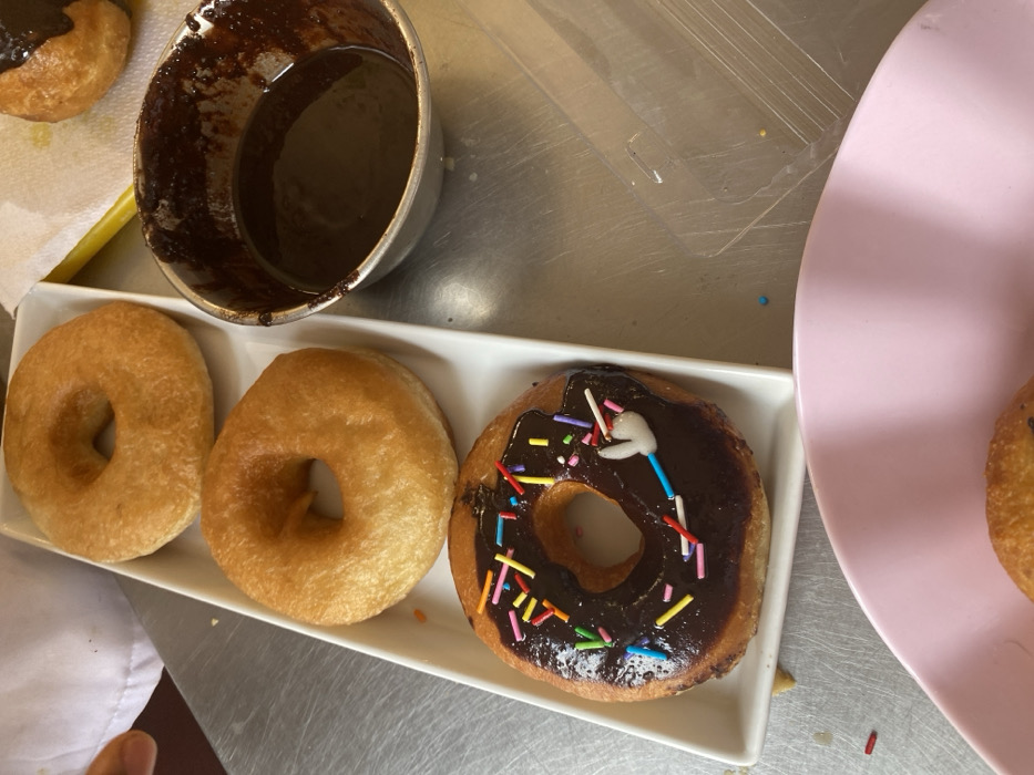 The scene depicts a food preparation area, possibly a kitchen, in Gwarinpa, Nigeria. The primary focus is on four ring-shaped donuts and associated glazing components positioned on a metallic, possibly stainless steel, counter surface. On a white, rectangular serving dish, three donuts are arranged in a vertical line. The uppermost and middle donuts are plain, golden-brown, and appear unfrosted. The lowermost donut on this dish is covered with dark brown chocolate glaze and adorned with multicolored cylindrical sprinkles. To the right of the rectangular dish, a silver metallic bowl contains a quantity of dark brown liquid chocolate glaze, with remnants of dried glaze visible on its interior rim. Further to the upper right, partially visible, another donut is present on a white paper towel, exhibiting partial dark brown glazing. A human hand, with light skin tone, is partially visible in the upper left corner, suggesting an ongoing preparation process. Scattered individual sprinkles (blue, red, yellow) are visible on the metallic counter surface, particularly below the glazed donut and to the right. A light pink, curved plate is partially visible in the bottom foreground, with a small portion of another donut visible on it.