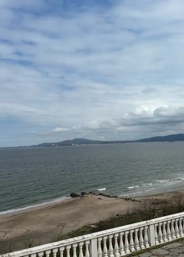The camera pans across a coastal scene, starting from a vantage point above a beach
