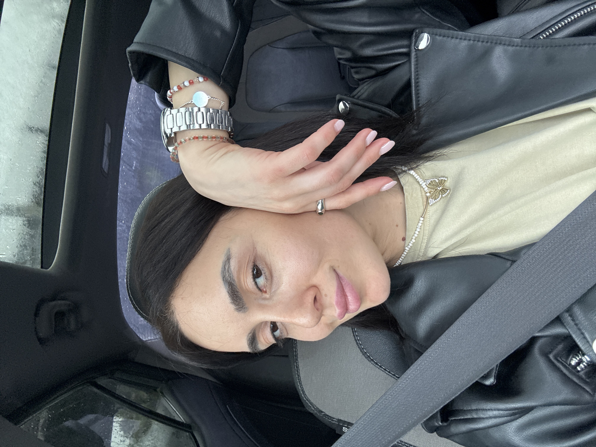 An adult female is depicted in the front passenger seat of a vehicle, secured by a grey seatbelt. She has dark hair, brown eyes, and is looking directly at the camera with a slight smile. She wears a light beige t-shirt under a black leather jacket. Her left hand is raised, resting with fingers splayed near the left side of her head. On her left wrist, she wears a silver-toned watch with a metal link band, two beaded bracelets (one reddish-orange, one white/red), and a thin silver chain bracelet with a circular charm. A silver-toned ring is on her left ring finger, and her fingernails are manicured with light pink polish. Around her neck is a beaded necklace with a prominent golden butterfly pendant featuring white accents. The vehicle's interior features dark-colored seats with grey fabric sections and stitching, and a sunroof is visible overhead. Raindrops are present on the exterior windows, indicating precipitation. The location is within the city of Tbilisi, Georgia.