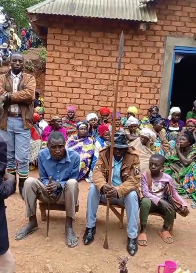 A man in a black suit is standing and talking to a crowd of people seated in front of a brick building. The speaker is a bald, dark-skinned man wearing a black jacket and khaki pants. Most of the seated people are women wearing colorful clothing and headscarves. Two men sit on chairs in the front row, each holding a long spear. A young boy sits between them. In front of them is a white plate with what appears to be cooked meat on a stick, as well as a loaf of bread and a pink mug. The ground is dirt. A man in a blue suit joins the speaker. They talk to each other.
