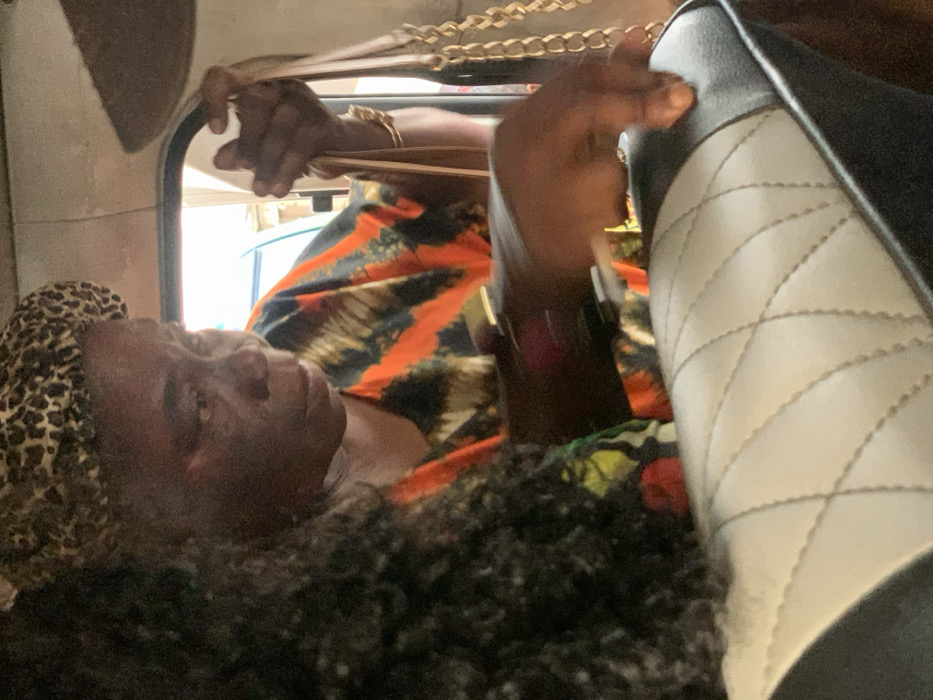 A woman with a leopard-print head covering leans back, her head resting on black curly hair. She wears a colorful orange and black top. Her hands hold a light brown leather item with a gold chain, while a black and white quilted handbag is partially visible. The scene appears to be inside a vehicle with a view of the outside.