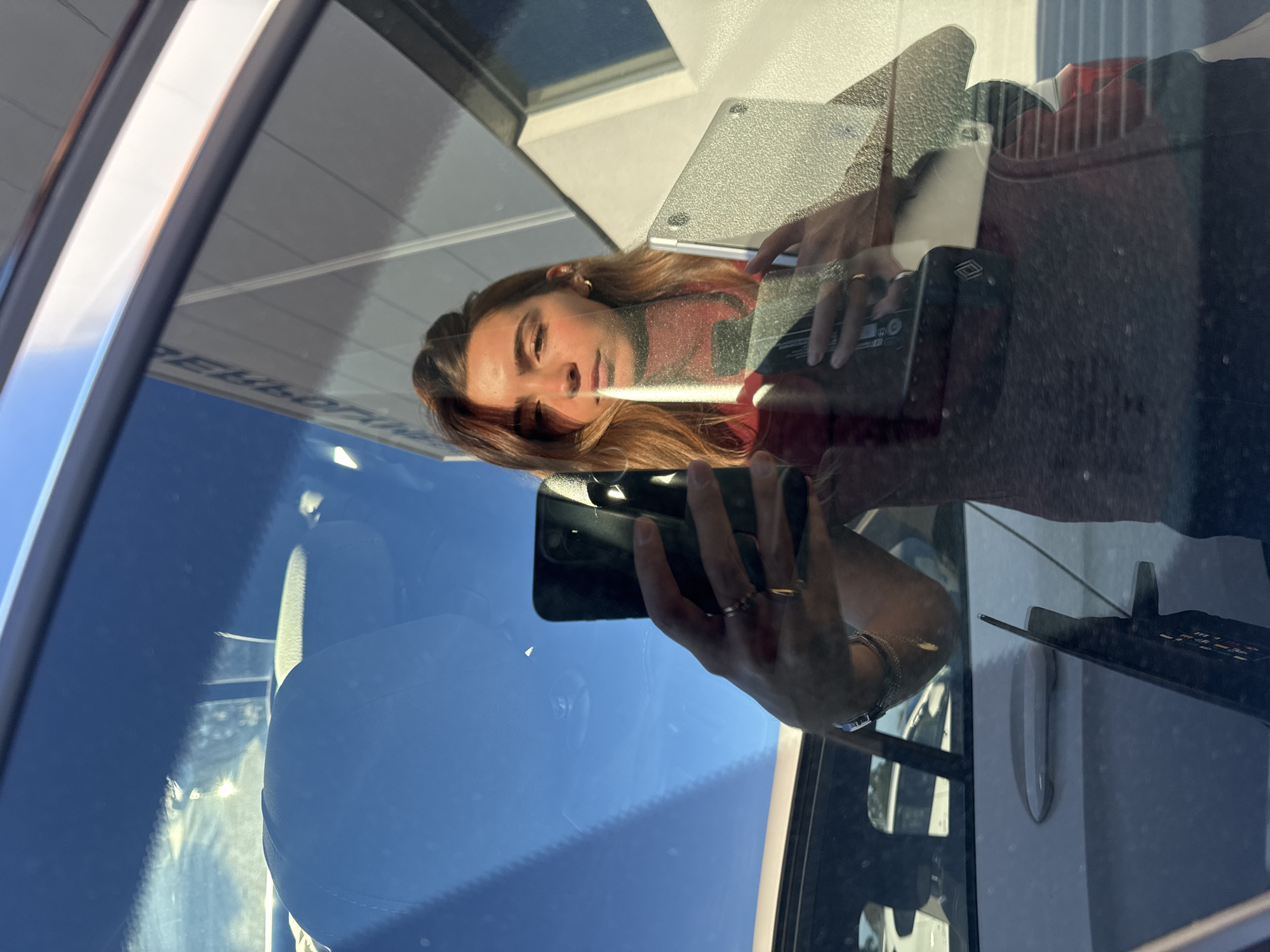 The image depicts a female individual, likely in her twenties, captured in reflection on the exterior of a vehicle's window. She holds a dark-cased smartphone in her right hand, oriented vertically, and a silver-colored tablet with a textured case in her left hand. Multiple rings adorn her fingers, and a wristwatch is visible on her left wrist. She has brown hair, a neutral facial expression, and a gold hoop earring in her visible left ear. The reflection behind the individual reveals a clear blue sky and a modern, light-colored commercial building with dark window frames. Partially legible text on the building's facade, reflected backward, spells "ECNAMROFREF" (PERFORMANCE), indicating the location is likely an automotive dealership or service center. Through the vehicle's glass, dark-colored headrests inside a car are visible. Further reflections and views through the glass show components of other vehicles, including a white car's door handle and a red rear light assembly. The scene is illuminated by direct sunlight. The specific location is identified as within the city of Torres Vedras, Portugal.
