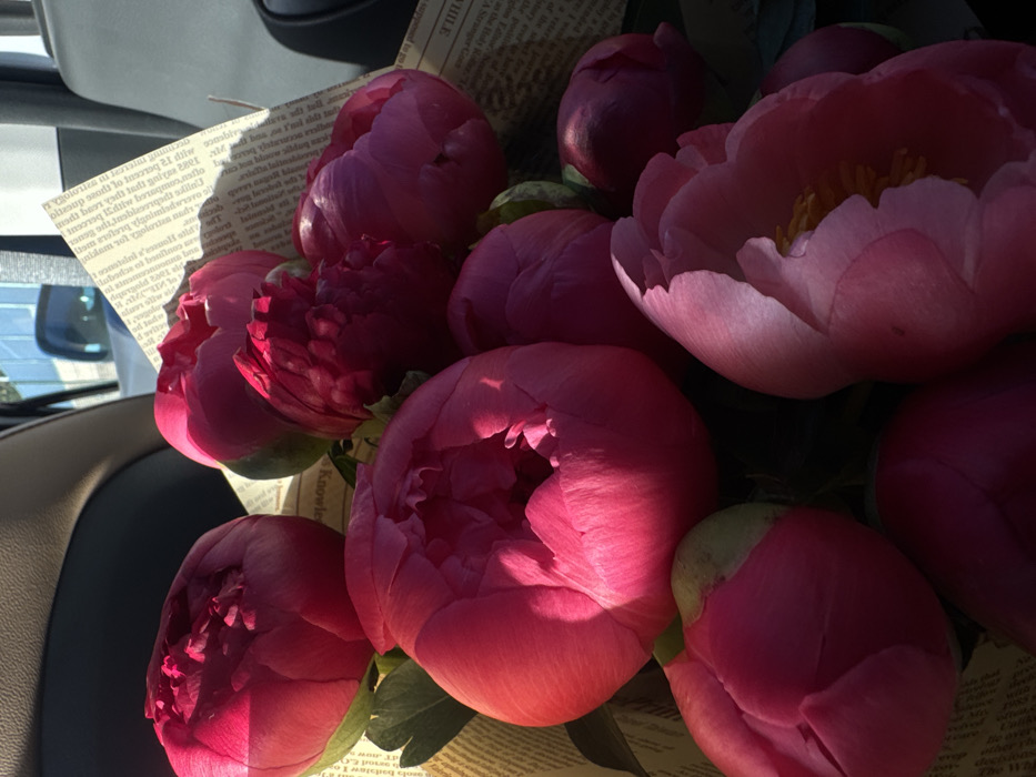 A bouquet of pink peonies is bundled in a beige paper printed with dense black text. The flowers are in various stages of bloom, some tightly budded and others fully open, revealing yellow stamens. Sunlight streams across the petals, creating stark contrasts between light and shadow. The bouquet sits inside a vehicle, with a glimpse of a white car exterior and a black leather interior visible in the background.