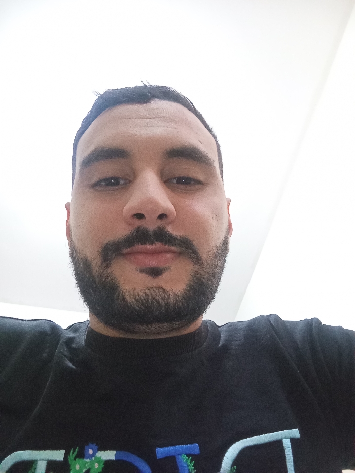An adult male is depicted in a close-up, upward-angled portrait. He has short dark hair, a neatly trimmed full dark beard and mustache, dark eyebrows, and dark eyes. His complexion is medium, and his expression is neutral with a closed mouth. He is wearing a dark, likely black, crew-neck t-shirt or sweatshirt with light blue and green embroidery visible on the lower portion. The background is uniformly light-colored, appearing as a plain wall and ceiling, with a subtle diagonal line indicating a corner in the upper right. The lighting is bright and even. There are no discernible features in the image to indicate a specific location within Ouislane, Morocco, or any other city.