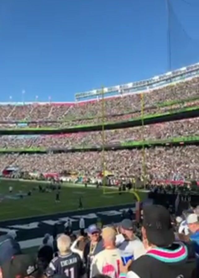 view from the stands at a football game in a packed stadium. The field is green, and a large scoreboard displays video. Spectators are visible, many holding up their phones to record the event. The sky is blue.