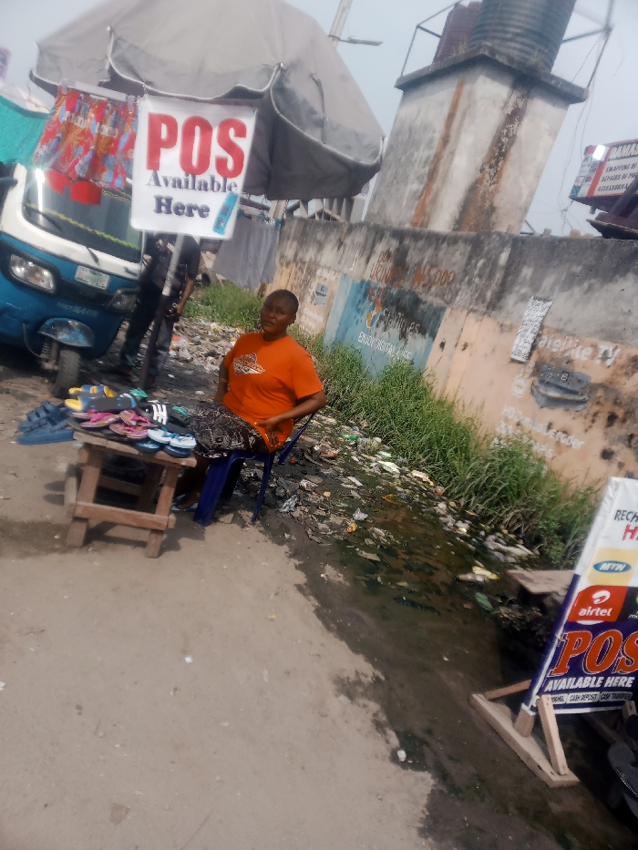 An adult female is seated on a blue plastic chair on an unpaved street in Igrwre-Ovie, Nigeria. She wears an orange short-sleeved t-shirt and a dark, patterned skirt, looking directly forward. To her left, a small wooden stool displays multiple pairs of rubber flip-flops in various colors. A large grey market umbrella overhead bears a white sign reading "POS Available Here" with a mobile device graphic. Partially visible behind her and the merchandise is the front section of a blue tricycle. Another individual is faintly discernible standing near the tricycle. To the right, an open drainage ditch filled with stagnant water and refuse runs alongside a stained concrete wall adorned with faded advertisements and graffiti, including "URINE #5000". Beyond the wall, a concrete pillar supports a dark water tank. In the foreground right, an A-frame sign reiterates "POS Available Here" with various mobile network and financial service logos. The immediate ground surface and the ditch contain substantial litter.
