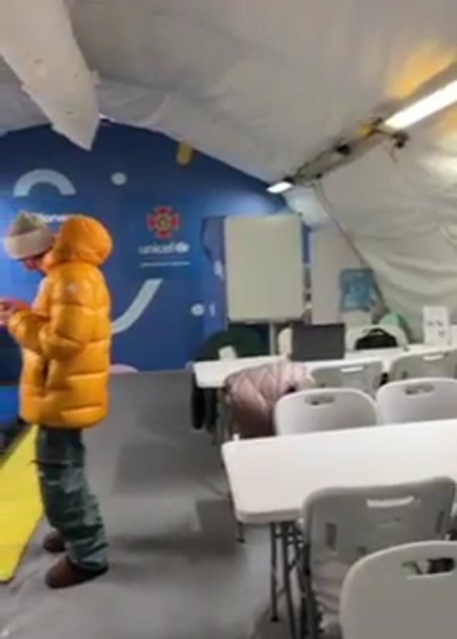 inside of a large white tent. Inside the tent, there are white folding tables and gray plastic chairs arranged as though for a classroom setting. Along one wall, there is a blue backdrop with UNICEF logos. A man in a yellow puffer jacket and a beige knit hat stands near a colorful mat. Another man wearing a black jacket and a black baseball cap walks towards the classroom area. The tent is lit by fluorescent lights hanging from the ceiling.