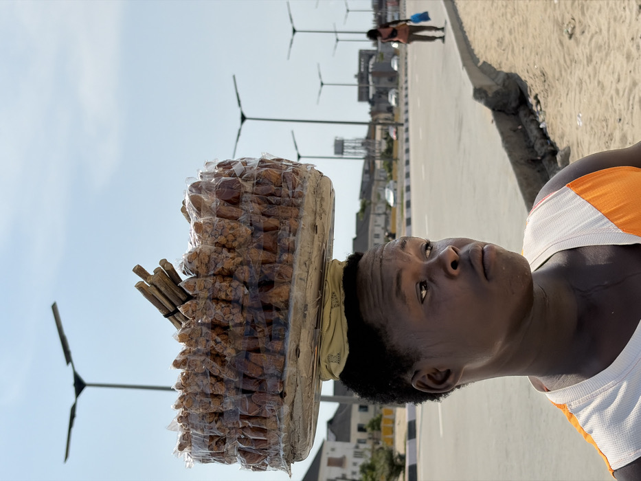 A young individual with short dark hair and dark skin, wearing a white and orange sleeveless top, is centrally positioned. A light-colored head wrap or cloth is visible beneath a large, rectangular tray balanced on their head. The tray holds multiple layers of individually plastic-wrapped, light brown, irregularly shaped food items, consistent with snacks or baked goods. A bundle of approximately ten thin, dark wooden sticks is secured upright in the center of the tray. The individual's head is turned slightly to the right, and their gaze is directed rightward and slightly upward. The subject is standing on a sandy or dirt ground adjacent to a concrete curb and a multi-lane paved road. White road markings are visible on the asphalt. In the background, numerous modern streetlights with T-shaped solar panels line the road, which extends into the distance. Residential or commercial buildings with light-colored facades and dark roofs are visible behind the streetlights, along with a raised water tank. A second person, distant and partially obscured, walks along the road's edge to the far right, carrying a blue bag. The sky is clear and light blue, indicating bright daylight conditions. The scene is located in Alaguntan, Nigeria.
