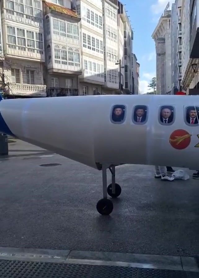 The camera captures a sidewalk view of a miniature, seemingly cardboard, model airplane positioned on a city street. The model is painted white and blue, bearing the name "XoldrAir" in gold lettering alongside a logo. Notably, the airplane windows feature images of political figures in suits. The background showcases urban architecture, with multi-story buildings lining both sides of the street under a partly cloudy sky. Several people are visible in the immediate vicinity, adding a sense of activity to the scene.